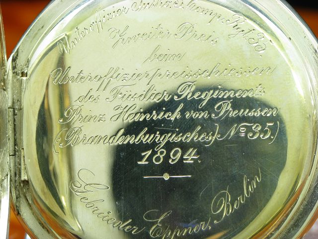 Fina Chopard & Favre 800 Silber Open Face Taschenuhr Gut erhaltene Fina Chopard & Favre Open Face Taschenuhr im hochfeinen 800er Silber Gehäuse Äußerst gepflegter Zustand Gelegenheit aus Privatsammlung Glanzvolle Fina Chopard & Favre Open Face Taschenuhr im originalen 0,800 Silber Gehäuse in einem guten Erhaltungszustand mit originalem Zifferblatt im unrestaurierten Zustand. Die Uhr ist ausgestattet mit einem weißen Emaille-Zifferblatt, schwarzen arabischen Ziffern, einer Strichminuterie im Außenbereich, einem silbernen Zeigerspiel in Birnform sowie einer kleinen Sekunde auf 6 Uhr. Das Zifferblatt weist eine Beschädigung zwischen 7 und 8 Uhr auf. Auf dem Staubdeckel befindet sich folgende Gravur: "Unteroffizier Jusko, 3. Comp., Ryt.35." "Zweiter Preis beim Unteroffizierpreisschiessen des Füsilier Regeiments Prinz Heinrich von Preussen (Brandenburgisches) NO35. 1894. Gebrüder Eppner, Berlin" Hochfeine Taschenuhr aus privater Sammlung, die durch das originale, unrestaurierte Zifferblatt mit den arabischen Indexen überzeugt. Nicht nur das Zifferblatt sondern auch das makellose Uhrwerk, sowie die einzigartige Materialverarbeitung, überzeugen auf den ersten Blick. |