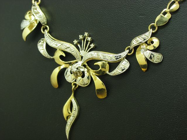 14kt 585 bicolor Gold Collier mit 0,13ct Diamant Besatz / 13,2g / 41,0cm Elegante 14kt. Gold Collier mit 0,13ct. Diamant Besatz Nahezu neu und ungetragen Gelegenheit aus Privatbesitz Traumstück, aufwändig besetzt mit Diamant kombiniert mit Gelb- und Weißgold in hochfeiner Qualität. |