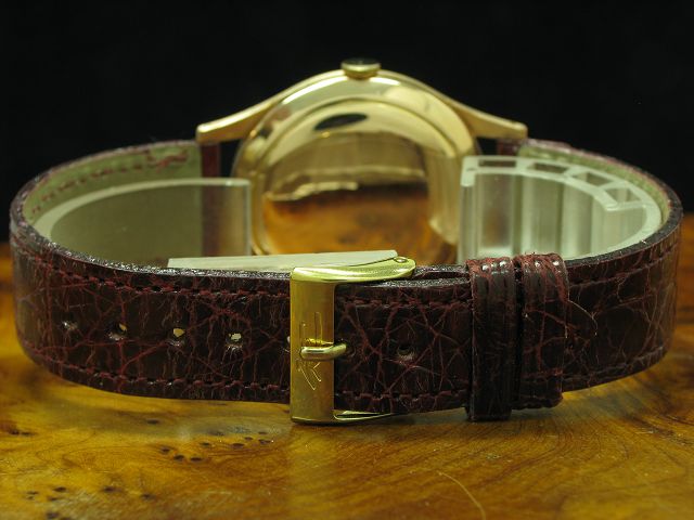 Doxa 14kt 585 Rotgold Automatic Herrenuhr / Kaliber 1256 / Anzuguhr Doxa Traumhafte Doxa Herrenuhr im 14kt. Gold Gehäuse in einem guten Erhaltungszustand. Die Uhr ist ausgestattet mit einem silbernen Zifferblatt mit goldenen Zeigern, goldenen Indexen, einer zentralen Sekunde und einem Gehäusedruckboden. Der Zeitmesser wurde in allen Bewertungskriterien vor Auktionsbeginn fachmännisch einer Prüfung unterzogen, bei der u.a. auch das Uhrwerk geprüft wurde. Angetrieben wird dieses Herrenmodell von einem Automatic-Werk. Die Auslieferung erfolgt auf einem dunkelroten Lederarmband mit einer vergoldeten Dornschließe. |