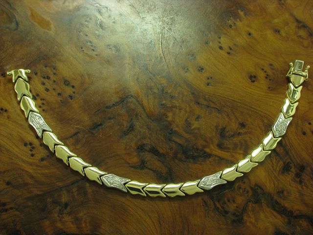 | Verkauf Schmuck Artikelnummer:123-6622 14kt 585 bicolor Gold Collier mit 0,13ct Diamant Besatz / 13,2g / 41,0cm | Preis: 1.350,00 Euro |