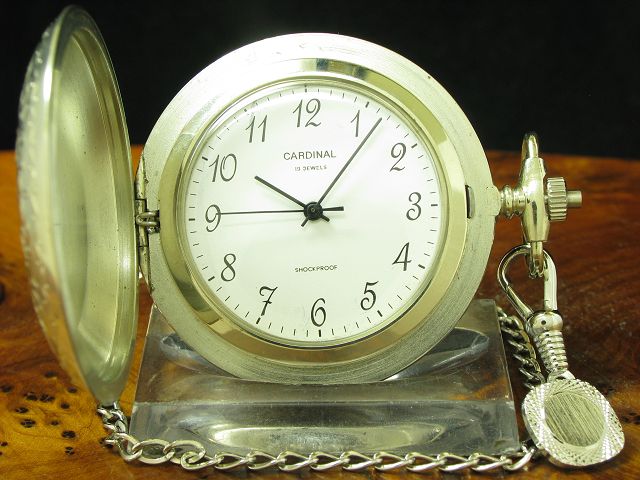 | Verkauf Taschenuhren Artikelnummer:100-1124 Cardinal Neusilber Savonette Sprungdeckel Taschenuhr / Kaliber Raketa 2609.HA | Preis: 450,00 Euro |
