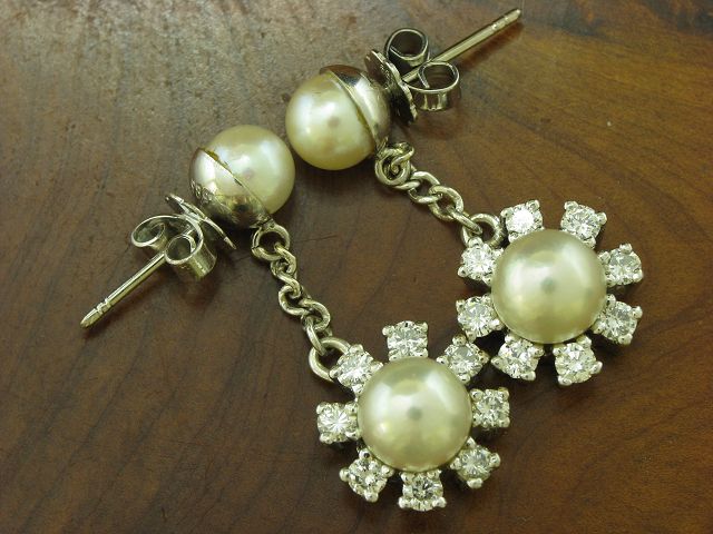 14kt 585 Weißgold Ohrhänger mit 0,80ct Brillant & Akoya-Perlen Besatz / 8,3g