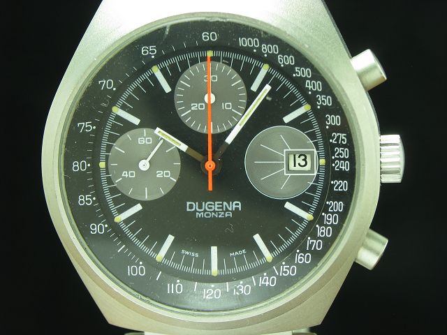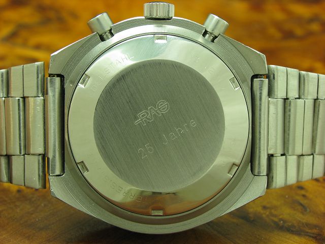 Dugena Monza Edelstahl Handaufzug Herrenuhr / RAG 25 Jahre / Kaliber 7765 Deutsche Uhrmacher-Genossenschaft Alpina Auslieferung inkl. RAG Uhren-Etui Traumhafte Dugena Monza Herrenuhr im Edelstahl Gehäuse in einem guten Erhaltungszustand. Die Uhr ist ausgestattet mit einem schwarzen Zifferblatt mit weißen Zeigern, weißen Strichindexen, einer kleinen Sekunde auf 9 Uhr, einer Chronographen-Funktion mit 30-Minuten-Anzeige, einer Datumsindikation mit Schnellschaltung auf 3 Uhr und einem geschraubten Gehäuseboden. Dieses Modell ist eine Jubiläumsausgabe für den Fortbestand der Ruhrkohle AG. Der Zeitmesser wurde in allen Bewertungskriterien vor Auktionsbeginn fachmännisch einer Prüfung unterzogen, bei der u.a. auch das Uhrwerk geprüft wurde. Angetrieben wird dieses Herrenmodell von einem Handaufzugs-Werk. Die Auslieferung erfolgt auf einem Edelstahl Armband mit Faltschließe. |