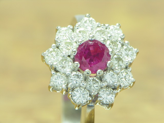 18kt 750 Weißgold Ring mit 1,26ct Brillant & 0,48ct Rubin Besatz / 8,1g / RG60,5 Eleganter 18kt. Weißgold Ring mit 1,26ct. Brillant Besatz und 0,48ct. Rubin Besatz Nahezu neu und ungetragen Gelegenheit aus Privatbesitz Traumstück, aufwändig besetzt mit Brillant und Rubin kombiniert mit Weißgold in hochfeiner Qualität. |