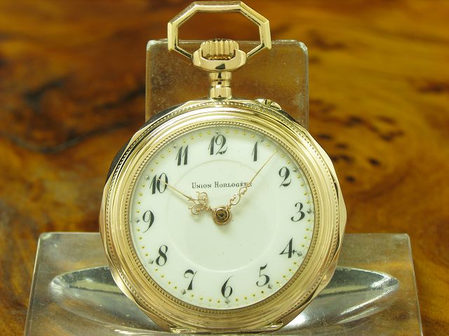| Verkauf Taschenuhren Artikelnummer:100-1415 Union Horlogere 8kt 333 Gold Open Face Taschenuhr / Durchmesser 30,0mm | Preis: 600,00 Euro |